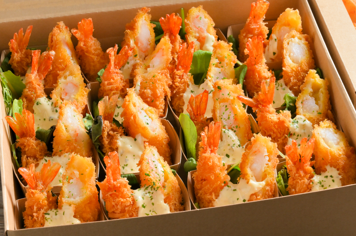 大きな箱の中に、ひと口サイズのエビフライカップを16個セットにしました。葉野菜の上にサクサクのエビフライをのせ、タルタルソースを添えています。みんなでシェアする場にぴったり。大きなエビフライをカットしているので食べやすく集まりにもおすすめです。