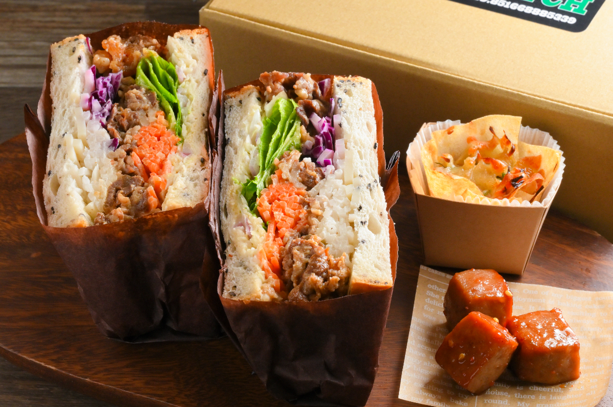 たっぷりの8種野菜と香ばしい焼肉をサンドしたボリューム満点の焼肉サンド。さらにジューシーなサイコロハムステーキがアクセントとなり、満足感がぐっとアップしました。セットの玄米キッシュは、玄米の香ばしさと野菜の旨みがぎゅっと詰まったヘルシーな一品。お肉も野菜も一度に楽しめる、ソミーズウィッチの満足度抜群のセットです。