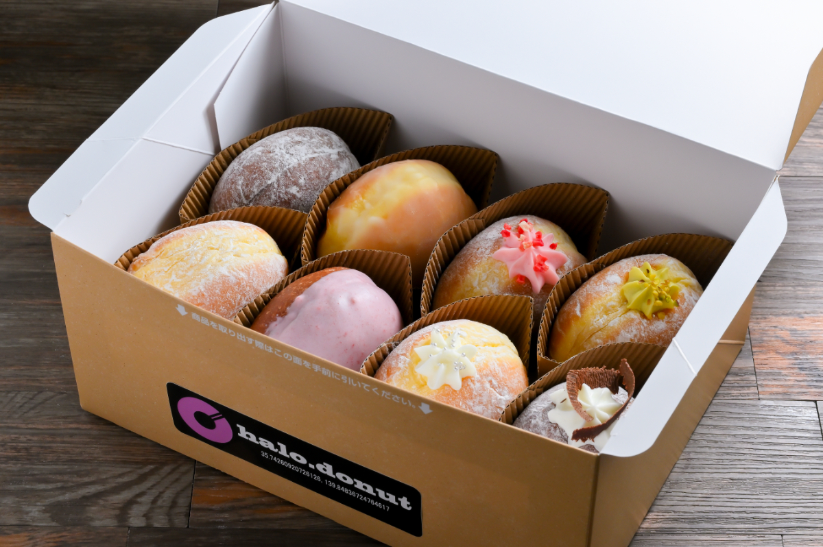 プレーン・チョコプレーン・シュガーグレーズ・チョコストロベリーグレーズの定番4種の他に牛乳クリーム・ストロベリークリーム・ピスタチオクリーム・チョコ生地牛乳クリームの生ドーナツが4個入る合計8個のオールスターセット。